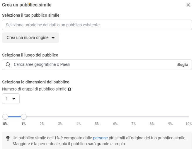 Una volta creato un pubblico personalizzato, puoi creare un pubblico simile sulla base di questo. Per le nostre campagne pubblicitarie su Facebook, iniziamo puntando all’avere l’1-3% degli utenti simili. Man mano che le campagne si ampliano, portiamo il pubblico simile al 10%. In questo modo massimizziamo la dimensione del pubblico e possiamo sfruttare l’apprendimento automatico di Facebook per indirizzare le giuste fasce di pubblico all’interno di quel gruppo.