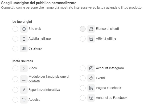 Il pubblico personalizzato ti permette di raggiungere su Facebook persone che già conoscono la tua attività. Per creare un pubblico personalizzato, puoi caricare i dati che possiedi, come ad esempio un elenco di e-mail oppure creare dall’inizio utilizzando diversi fonti.