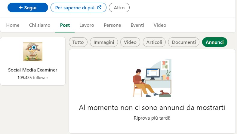 Per filtrare il contenuto organico clicca su Annunci. In questo modo vedrai gli annunci attivi della pagina. La scheda degli annunci mostra solo quelli attuali, non quelli delle campagne passate. Se l’azienda, quindi, non ha annunci attivi al momento vedrai una notifica come quella qui sotto.