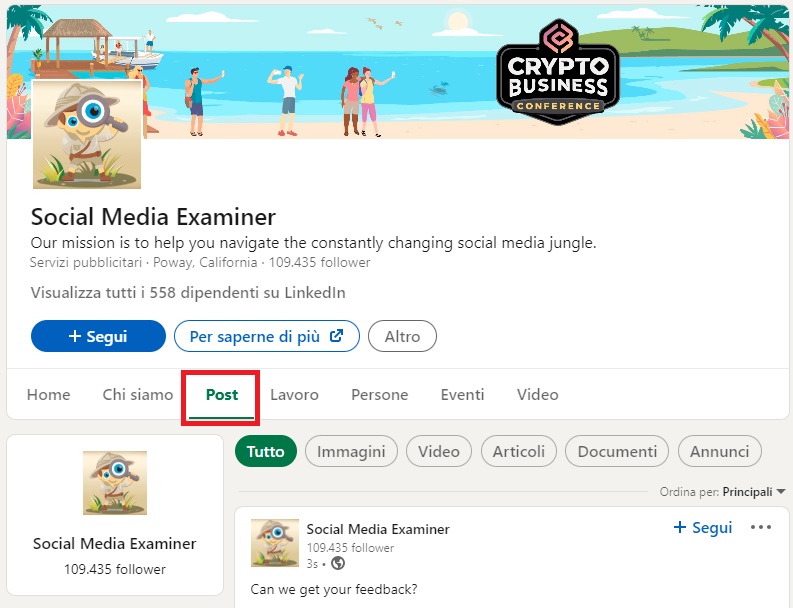 Una volta trovate le pagine aziendali dei competitor, cliccaci sulla scheda “Post” mostra un feed con tutti i contenuti postati dalla pagina. Include tutti i contenuti: link, articoli, documenti ed eventi di LinkedIn Live.