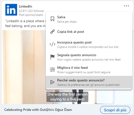 I passi da seguire se stai usando l’app di LinkedIn è simile. Clicca sui tre puntini in alto a destra di qualsiasi annuncio e seleziona “Perché vedo questo annuncio?”.