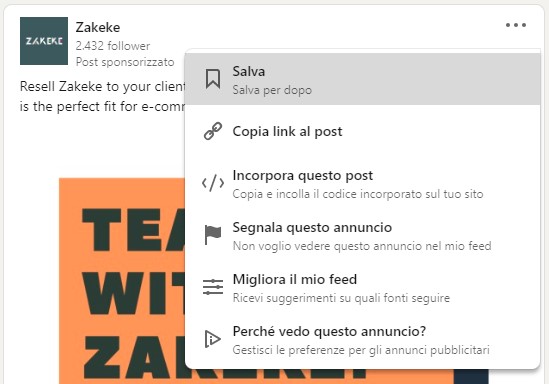Quando noti un annuncio interessante sul tuo feed puoi cliccare sui tre puntini in alto a destra per visualizzare ulteriori azioni. Per inserire un annuncio tra i preferiti – per poterlo consultare in seguito – clicca su Salva e aggiungilo alla tua libreria personale.