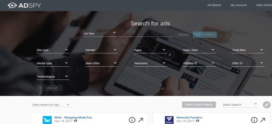 Se non sei soddisfatto delle funzioni e degli strumenti avanzati offerti da Dropispy, il prossimo consiglio in lista sarebbe AdSpy, grazie alle sue funzioni e ai filtri, ma non offre alcuna estensione per chrome.