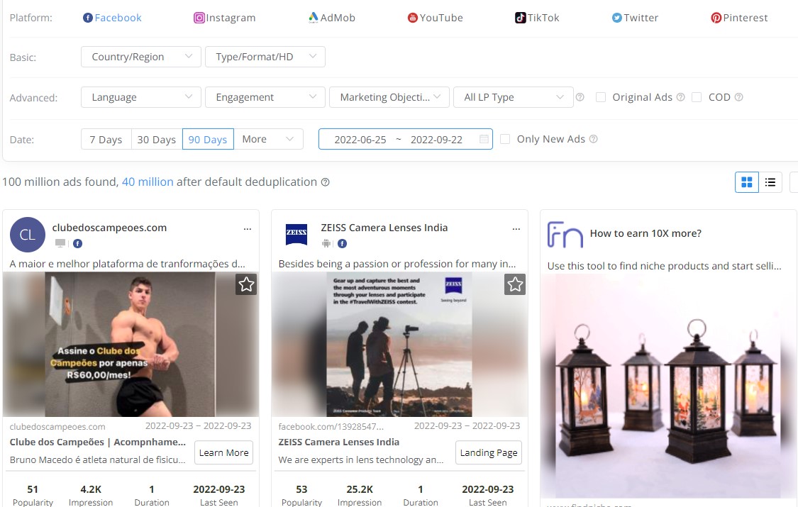 Adspy ha superato la maggior parte degli spy tools per gli annunci attualmente disponibili sul mercato. AdSpy dispone di un enorme database di annunci su diverse piattaforme, come: Facebook Ads, Instagram Ads e molto altro. AdSpy non ha solamente uno dei più grandi database di annunci organici, ma funziona anche come spy tool globale per gli annunci, coprendo ben 216 paesi. AdSpy ha anche un gran numero di inserzionisti – intorno a 17 milioni – e circa 114 milioni di annunci: nulla di strano per uno spy tool con uno dei più grandi database ricercabili di annunci Instagram e Facebook.